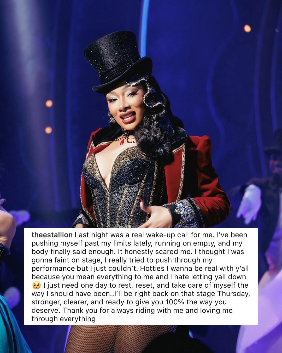 Megan Thee Stallion speaks out after exiting ‘Moulin Rogue!’ mid-performance last night: “I’ve been pushing myself past my limits lately, running on empty, and my body finally said enough… Hotties I wanna be real with y’all because you mean everything to me and I hate letting yall down 🥺”