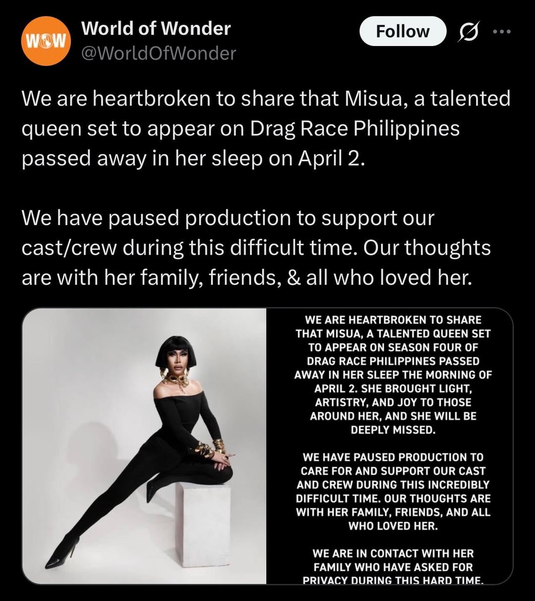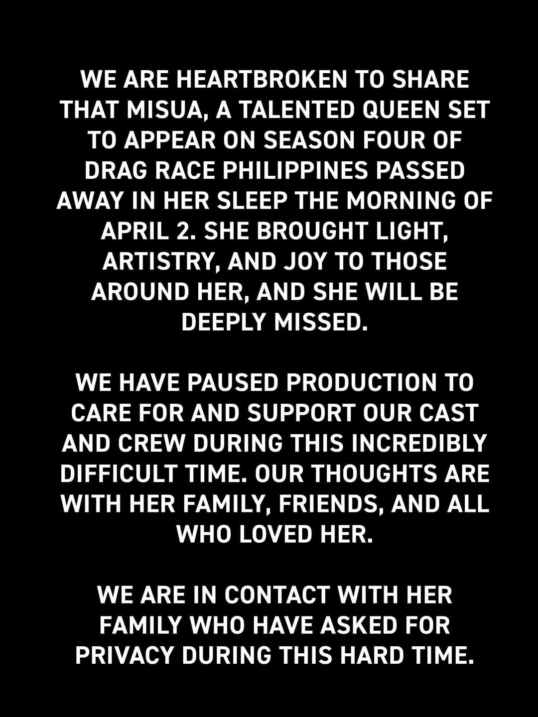 World of Wonder confirms that Misua, who was cast on the fourth season of Drag Race Philippines, has passed away aged 27 during the filming of the season. Rest in power.