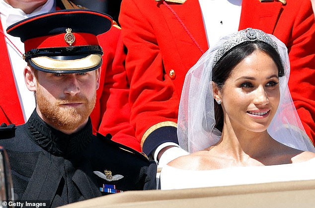 Meghan wore Queen Mary¿s diamond bandeau, but the loan of the tiara by the Queen led to a row when when the Sussexes rang the Palace to ask the Queen¿s dresser and curator, Angela Kelly, to send over the tiara because Meghan wished to practise putting it on