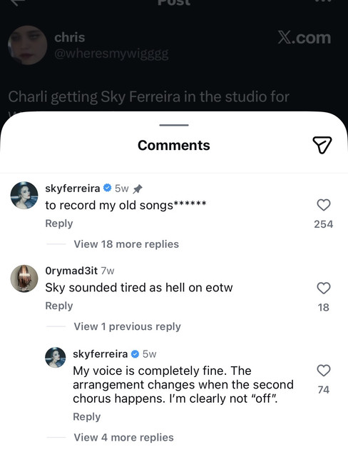 Back in February upon the release of Wuthering Heights, Ferreira responded to a meme post on Instagram about Charli dragging her into the studio to make the album. “To record my old songs,” Ferreira commented, without any further clarification.