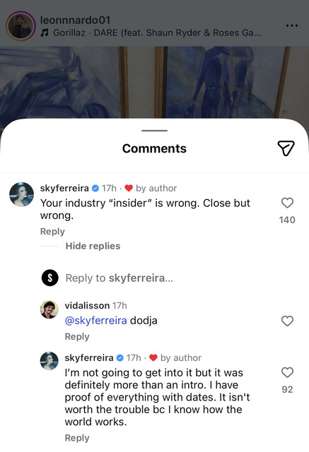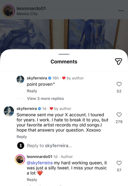 Ferreira isn’t on X, but she found Leon’s Instagram page and used the comments there to respond: “I toured for years. I work. I hate to break it to you, but your favorite artist records my old songs.” In another comment, she wrote: “Your industry ‘insider’ is wrong. Close but wrong.” In the longest comment, she went into detail: