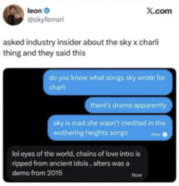 More recently, a fan named Leon (@skyferrori) caught attention on X for posting a since-deleted screenshot of a text exchange with an “industry insider” who claimed that aside from “Eyes Of The World,” Wuthering Heights songs “Chains Of Love” and “Alters” were lifted from unreleased Ferreira demos. Last Friday, Leon reposted a clip of Ferreira’s “Everything Is Embarrassing” video, commenting “I wonder what’s her form of income.”