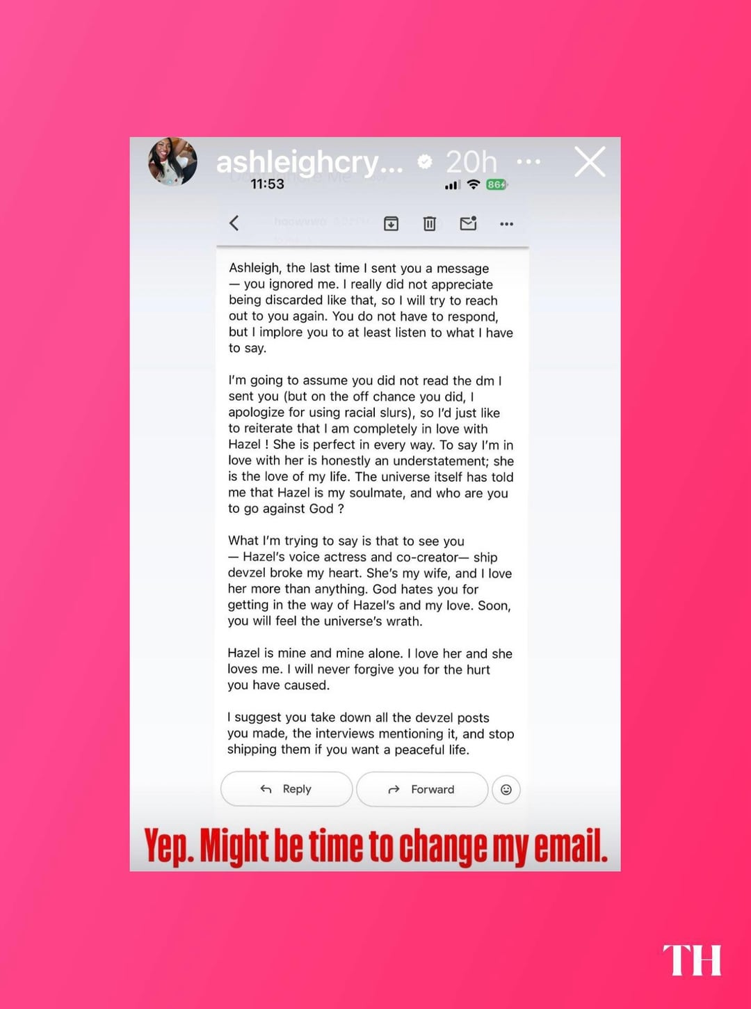 That email just gets continually worse to say that person needs help is an understatement yikes I feel for Ashleigh genuinely worried about her safety imagine having to read that.