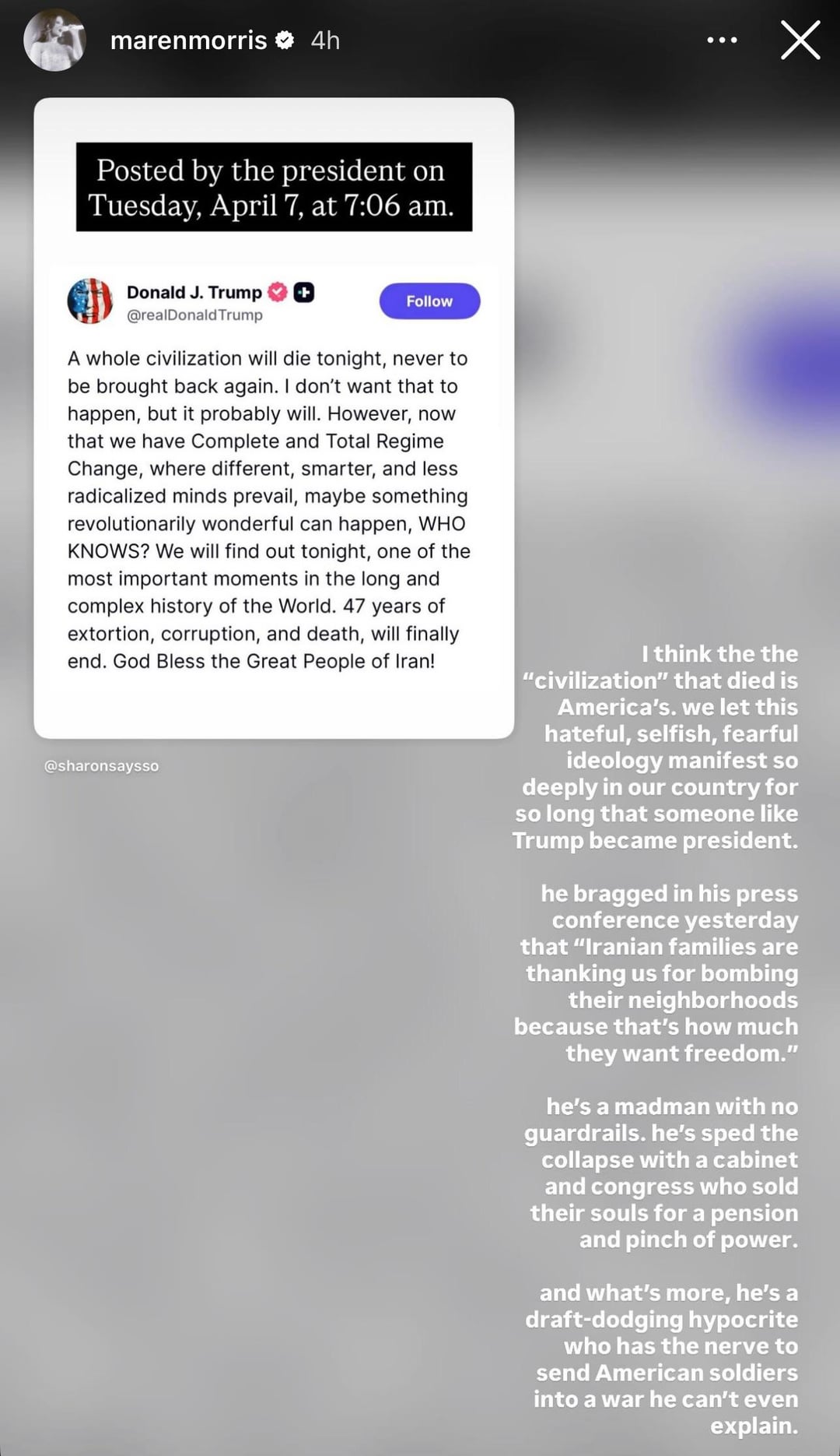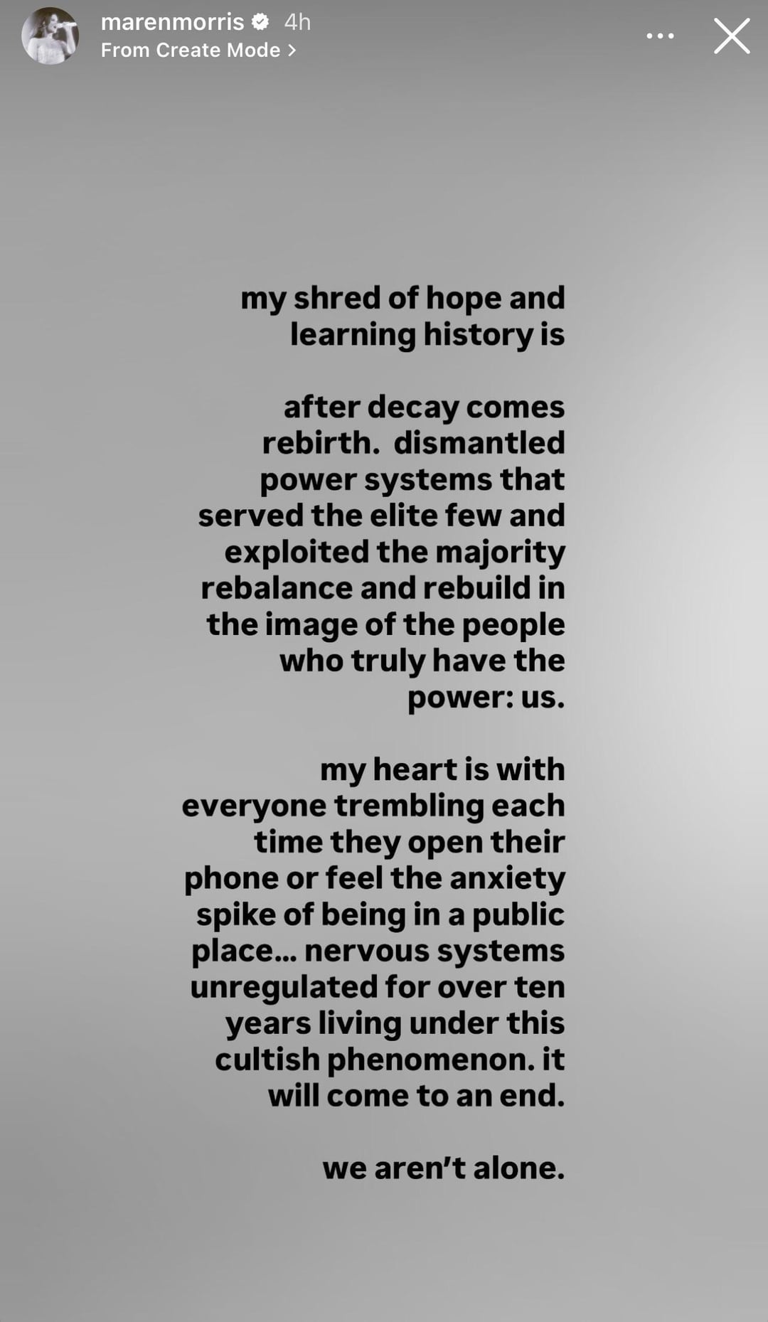 Country singer Maren Morris: I think the “civilization” that died is America’s. we let this hateful, selfish, fearful ideology manifest so deeply in our country for so long that someone like Trump became president.