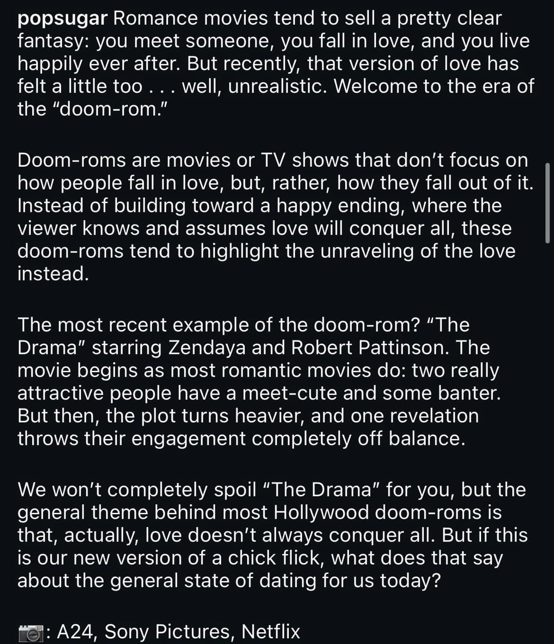 I feel like that’s only if you’re choosing to focus on specific movies. Idk I think rom-coms are still being released, just no one takes them seriously. But for sure, people are watching both if not multiple genres. Most popular rom-coms are still the older ones, though, because some people feel they were more authentic. But fear not, more than one genre of movie can exist in the zeitgeist at a time.