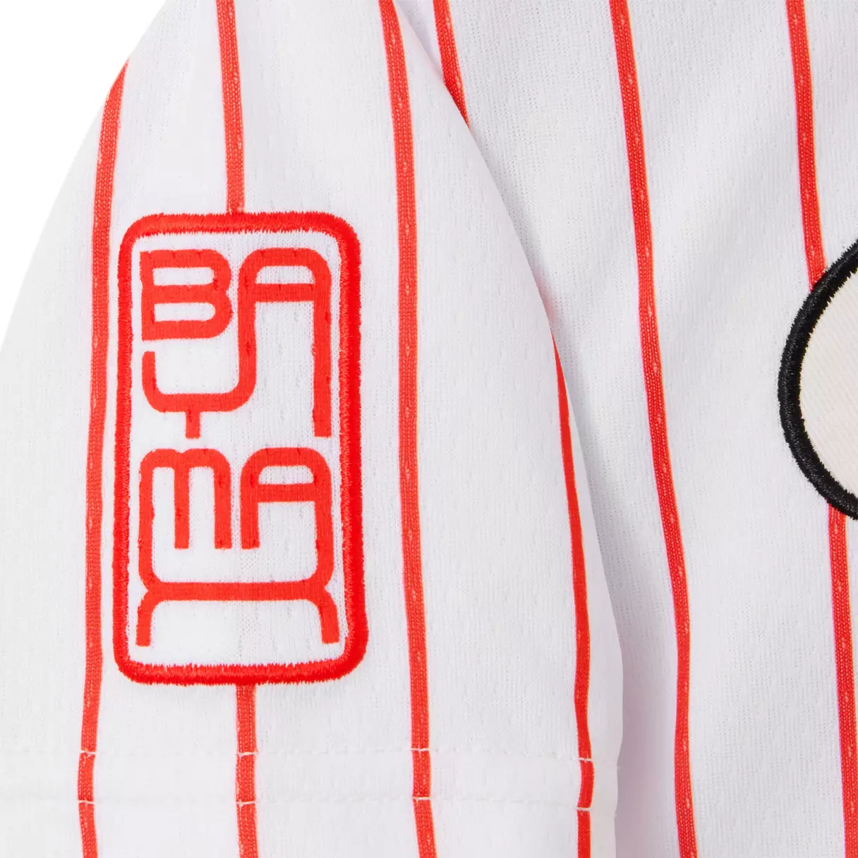In white with red vertical stripes, this baseball jersey has five white buttons on the front. There is a patch of Mochi the cat on the left side and Baymax on the right.