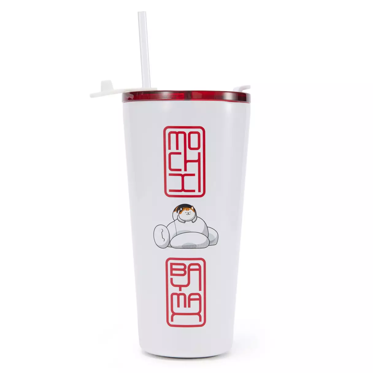 This white tumbler also features Baymax and Mochi. The front features Mochi sitting on Baymax’s head, with the words “Bah-da-la-la-la” in red above. The stylized “Mochi” and “Baymax” names from the jersey above are on the back of the tumbler with an image of Mochi sleeping on Baymax’s belly.
