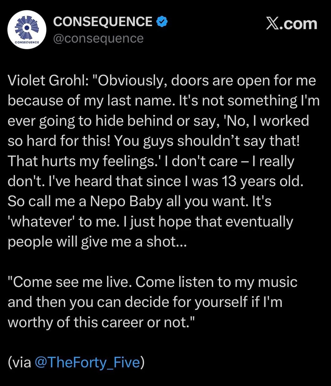 Violet Grohl: “Obviously doors are open for me because of my last name. It’s not something I’m ever going to hide behind or say, ‘No, I worked so hard for this! You guys shouldn’t say that! That hurts my feelings.’… Come listen to my music and then you can decide for yourself if I’m worthy or not.”