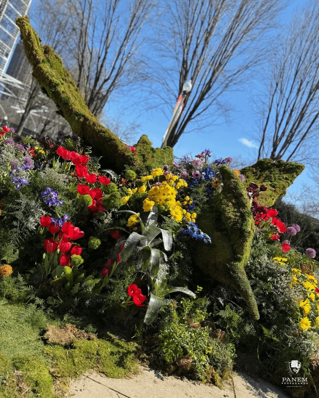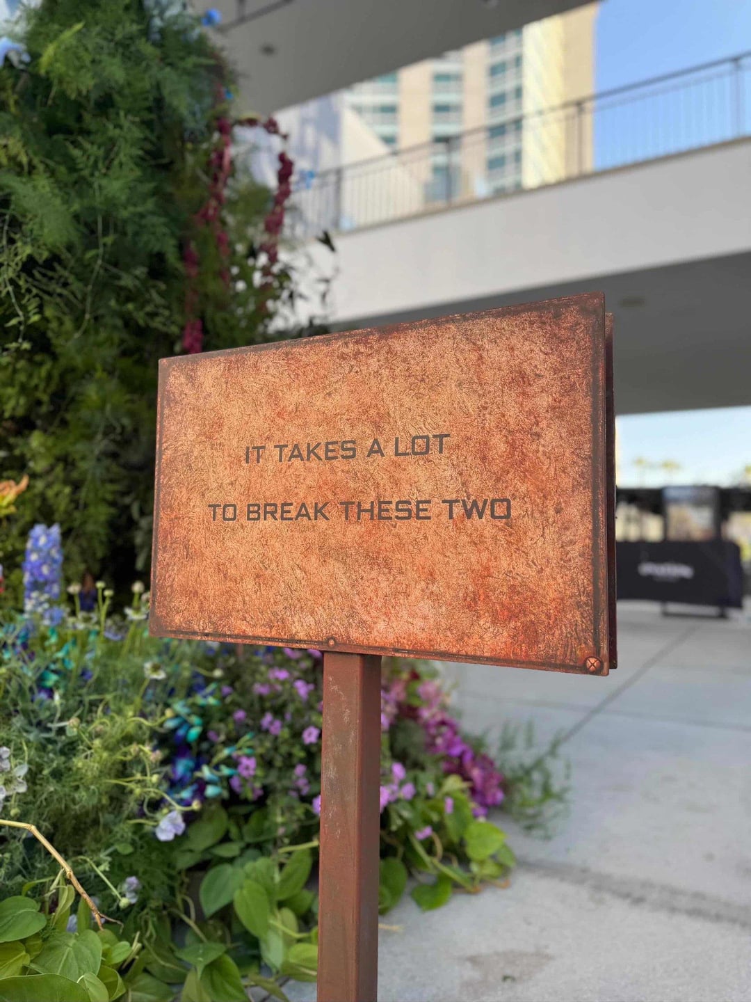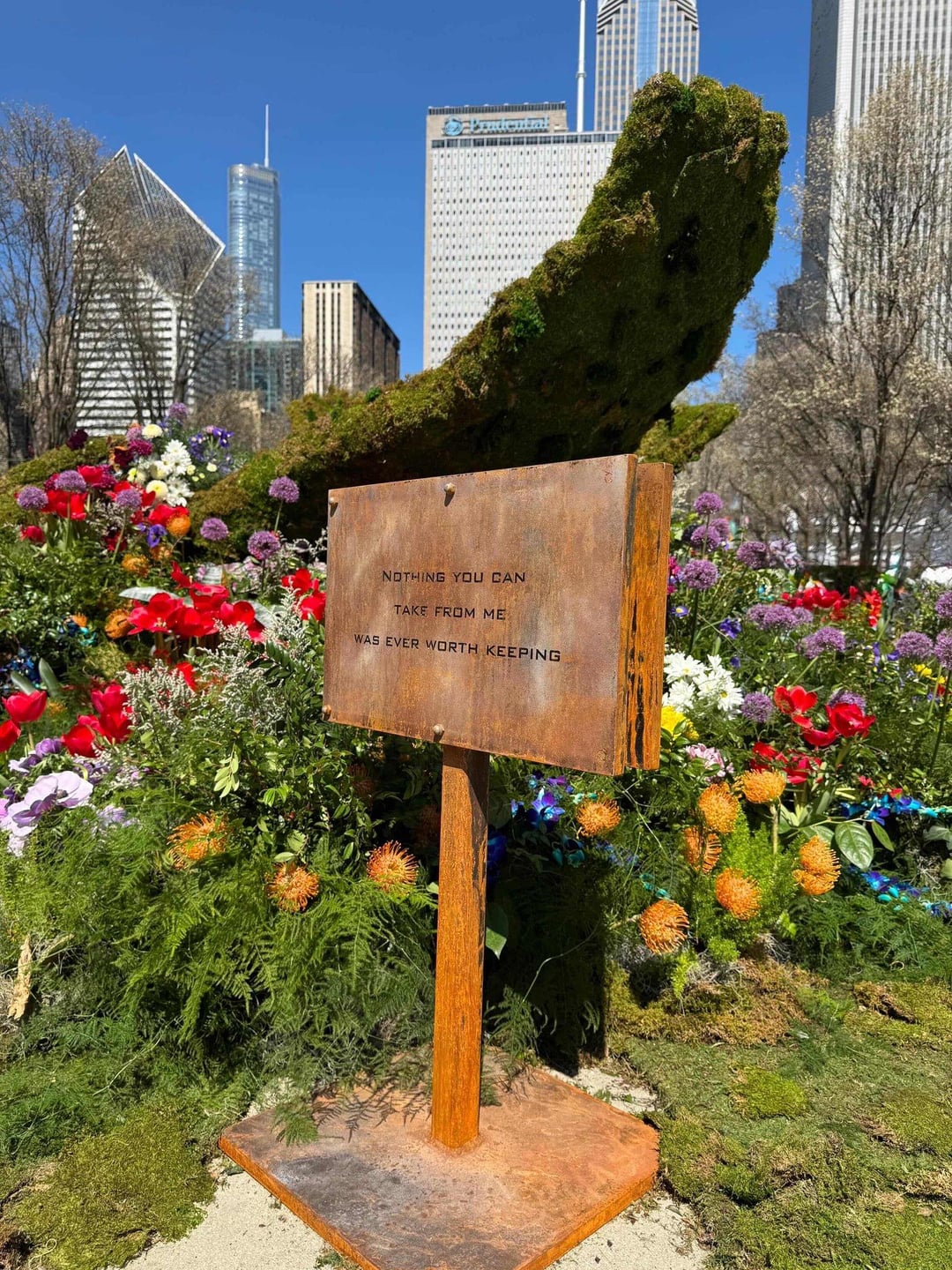 the flowers in boxes at the base of the sculpture in slide 9–they have some sort of paper attached to them and look like they’re meant to be taken by passersby. has anyone seen this one in person, and taken a flower? what does that card on it say?