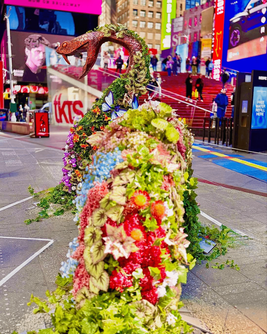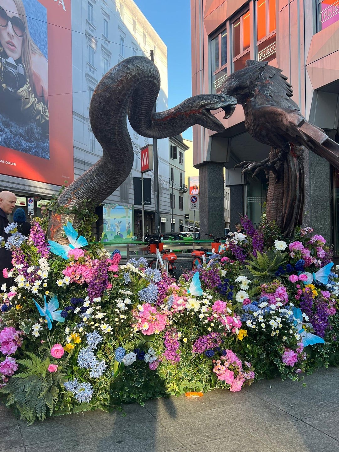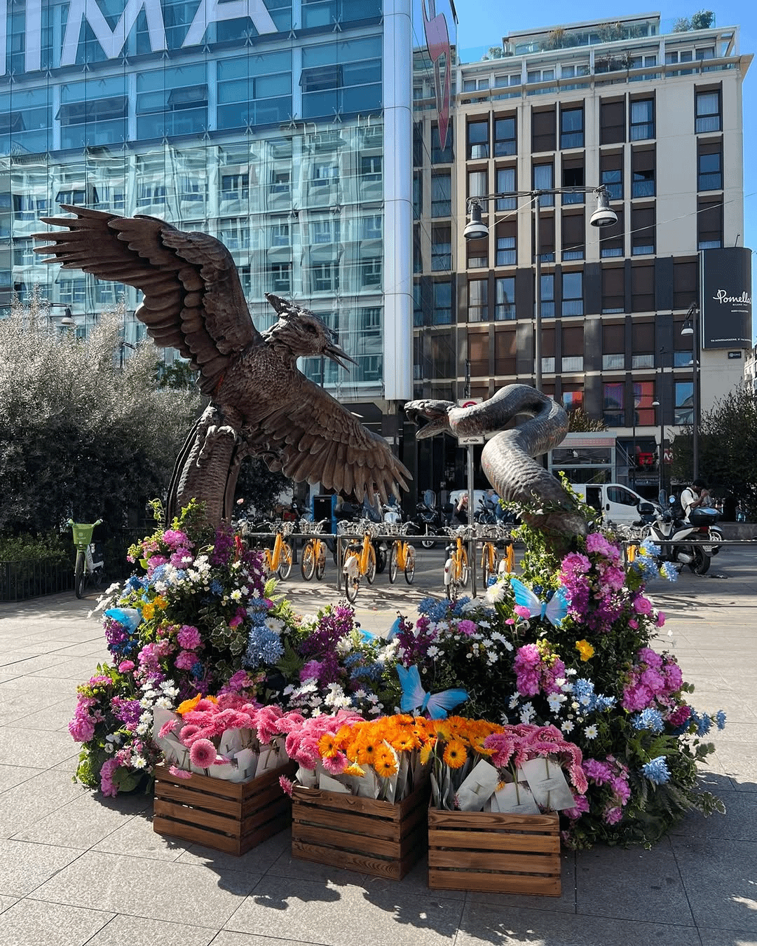 the flowers in boxes at the base of the sculpture in slide 9–they have some sort of paper attached to them and look like they’re meant to be taken by passersby. has anyone seen this one in person, and taken a flower? what does that card on it say?