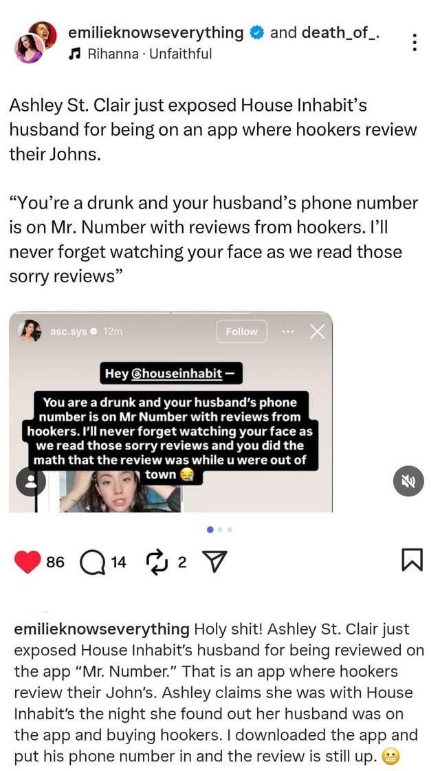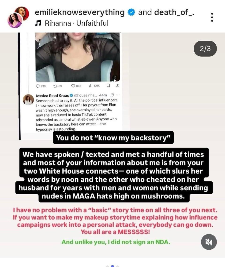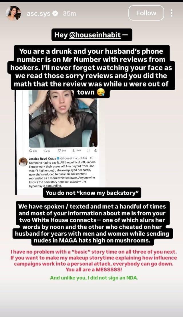 Ashley is one of Elon Musk’s baby moms – she turned on the maga movement after getting burned by Musk. Kraus is a mommy blogger who turned MAGA influencer around the pandemic and then closely weaseled in her way into RFKs cohort. Kraus harassed Virginia Giuffre relentlessly, accusing her of lying about her involvement with Epstein, taunting her both before and after her death. There’s been a schism in the conservative far right influencer community, and Ashley made this post claiming Kraus’ husband has been reviewed by sex workers online after soliciting their services.
