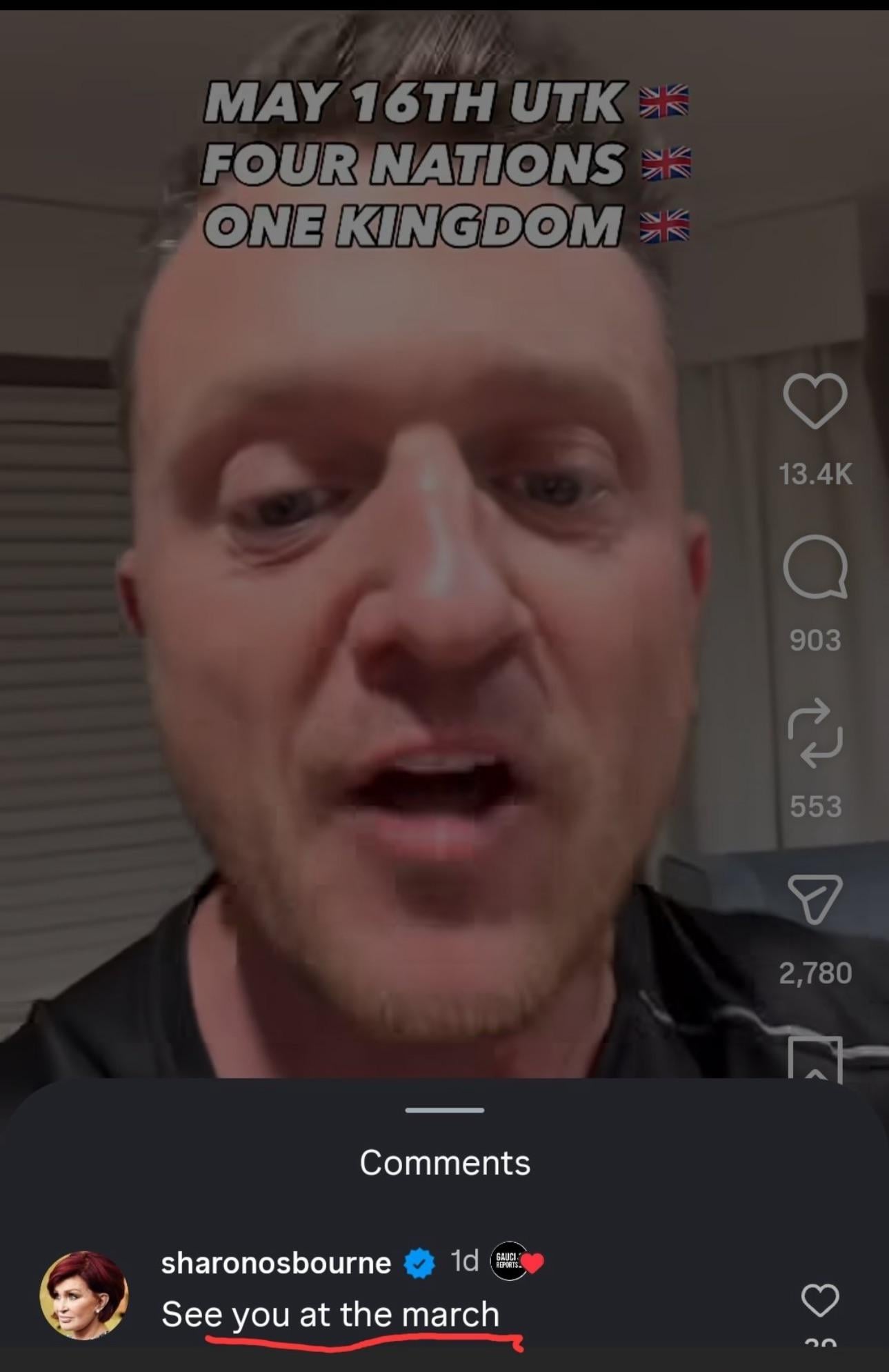 Sharon Osbourne has thrown her support behind a far-right, anti-immigration rally organised by Tommy Robinson