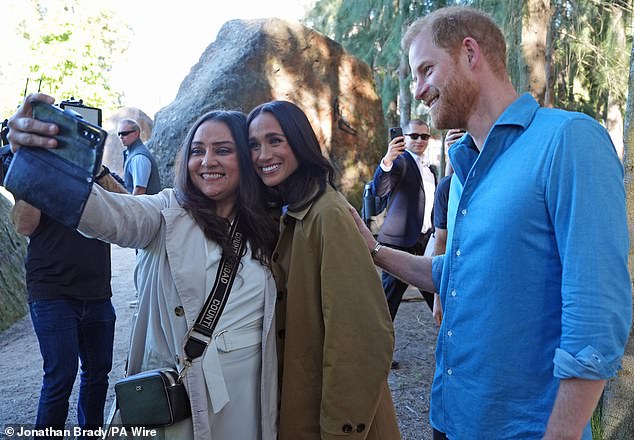 Earlier in the day Meghan’s protective husband looked annoyed when he was cornered by a television reporter for an awkward selfie.