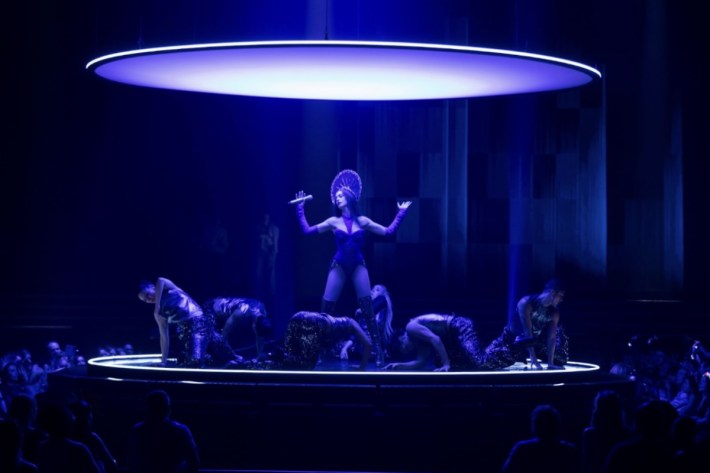 For the most part, Mother Mary seems like a slightly tonier version of recent fictional gothic-cinema pop stars — Lady Raven from Trap, Skye Riley from Smile 2, Jocelyn from The Idol, Celeste from Vox Lux. (August Moon, the very funny fake One Direction from the previous Anne Hathaway joint The Idea Of You, do not belong to this canon.) Plausibility isn’t the point of Mother Mary, but Mother Mary herself, with her futuristic lighting and her architectural stage design, is a more plausible pop star than most of her fictional peers. Hathaway has the alien charisma to play just such a figure. In the scene where she sings the soundtrack song “Holy Spirit 2,” I got just a hint of the charge that I get at actual arena-level pop shows.