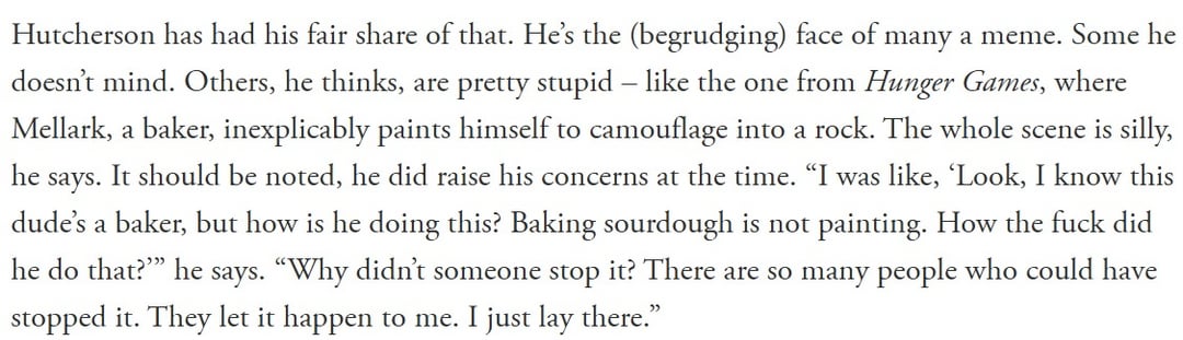 2. Hasn’t he been saying this for the past 14 years? That he thought that scene was stupid? Personally I thought the Rue being killed scene was stupid and I am still traumatized to this day from that scene.