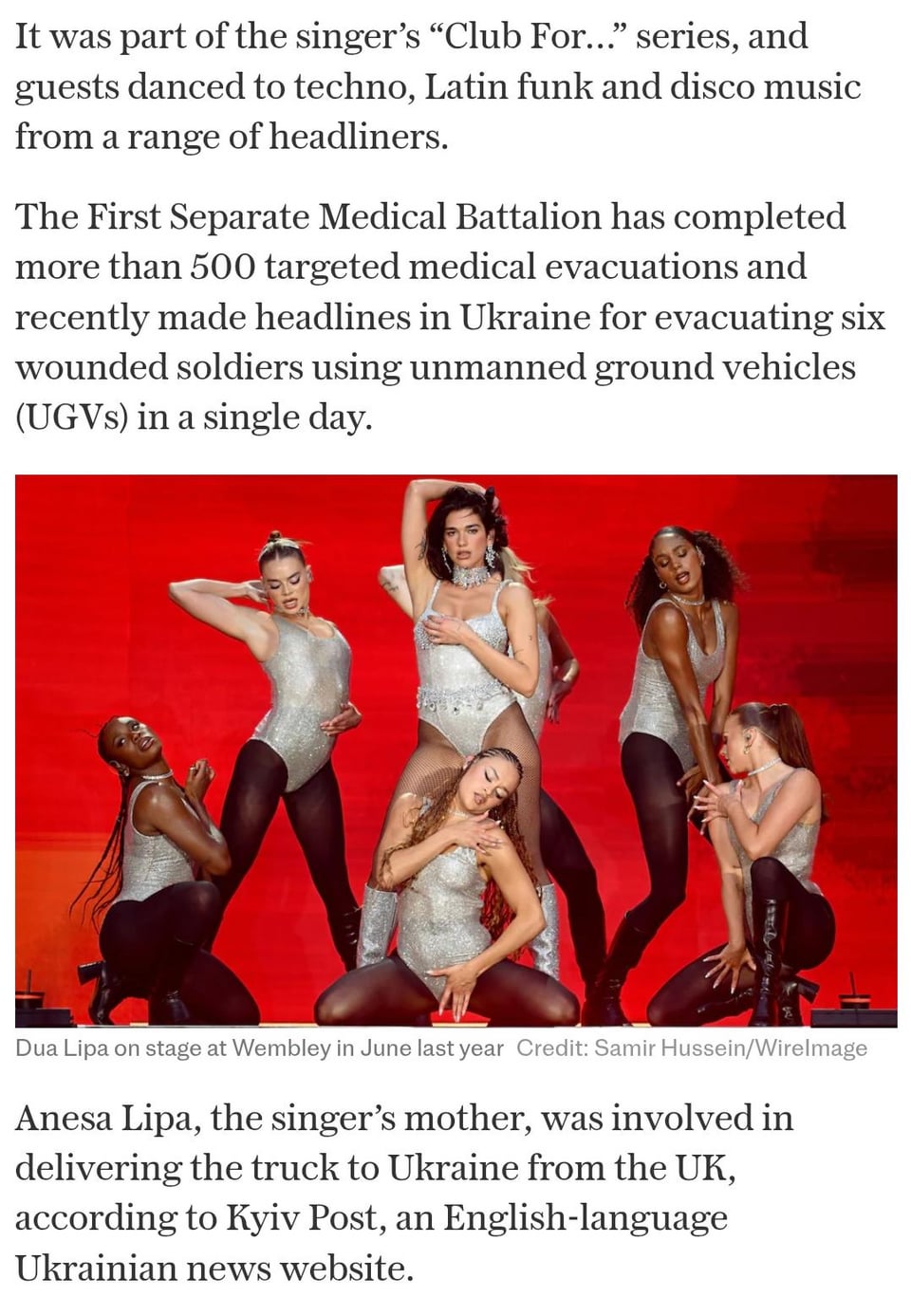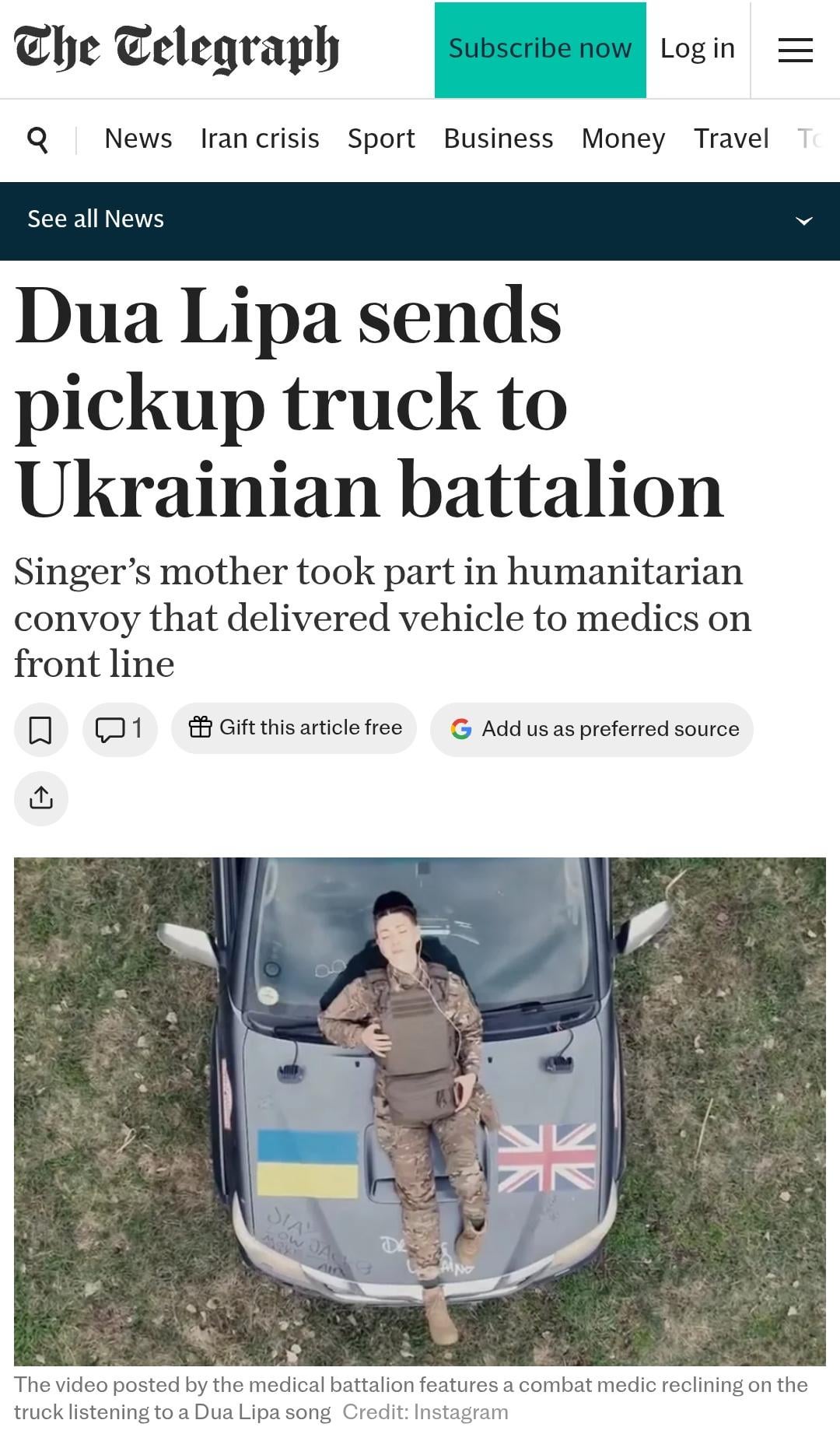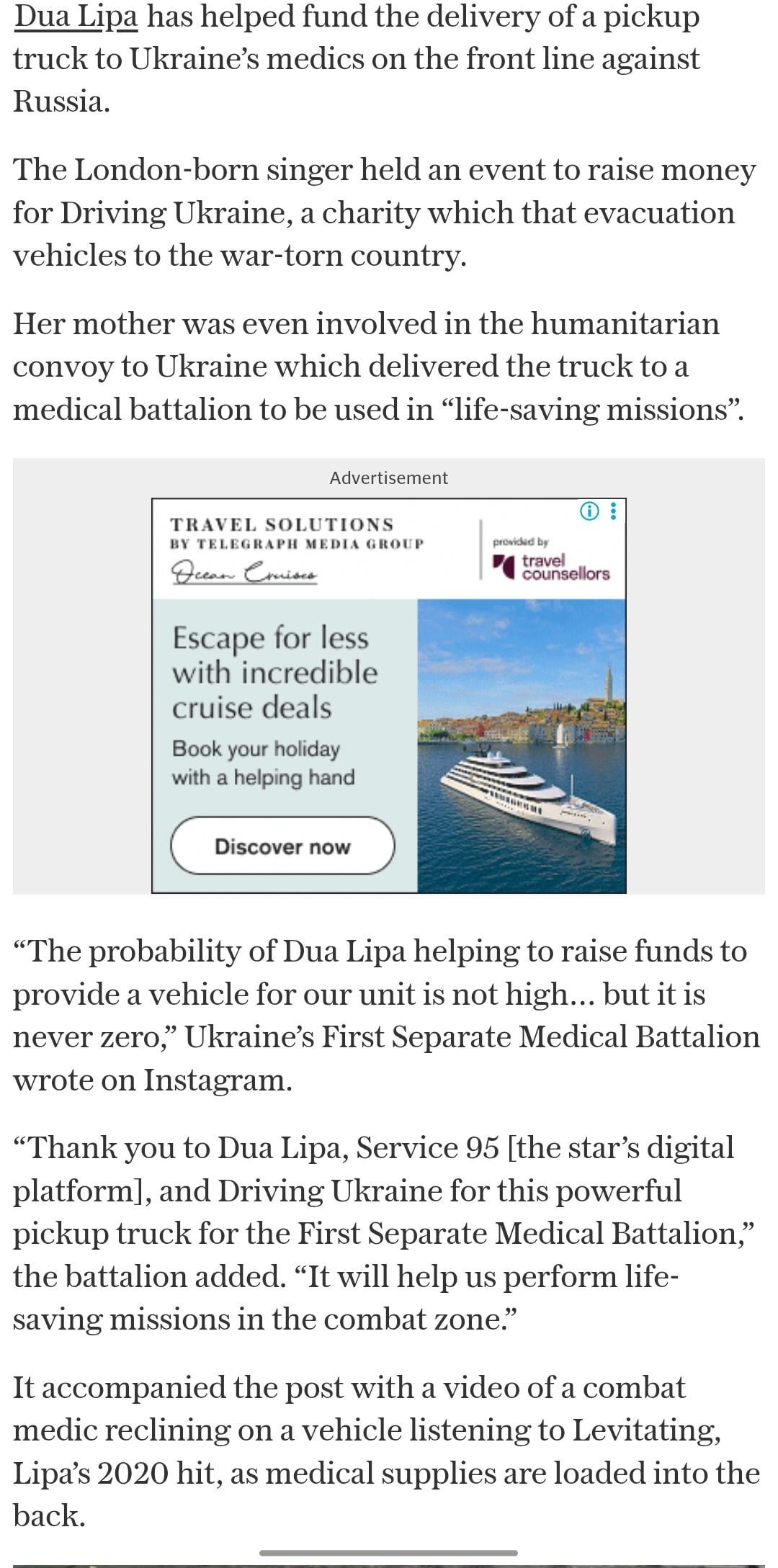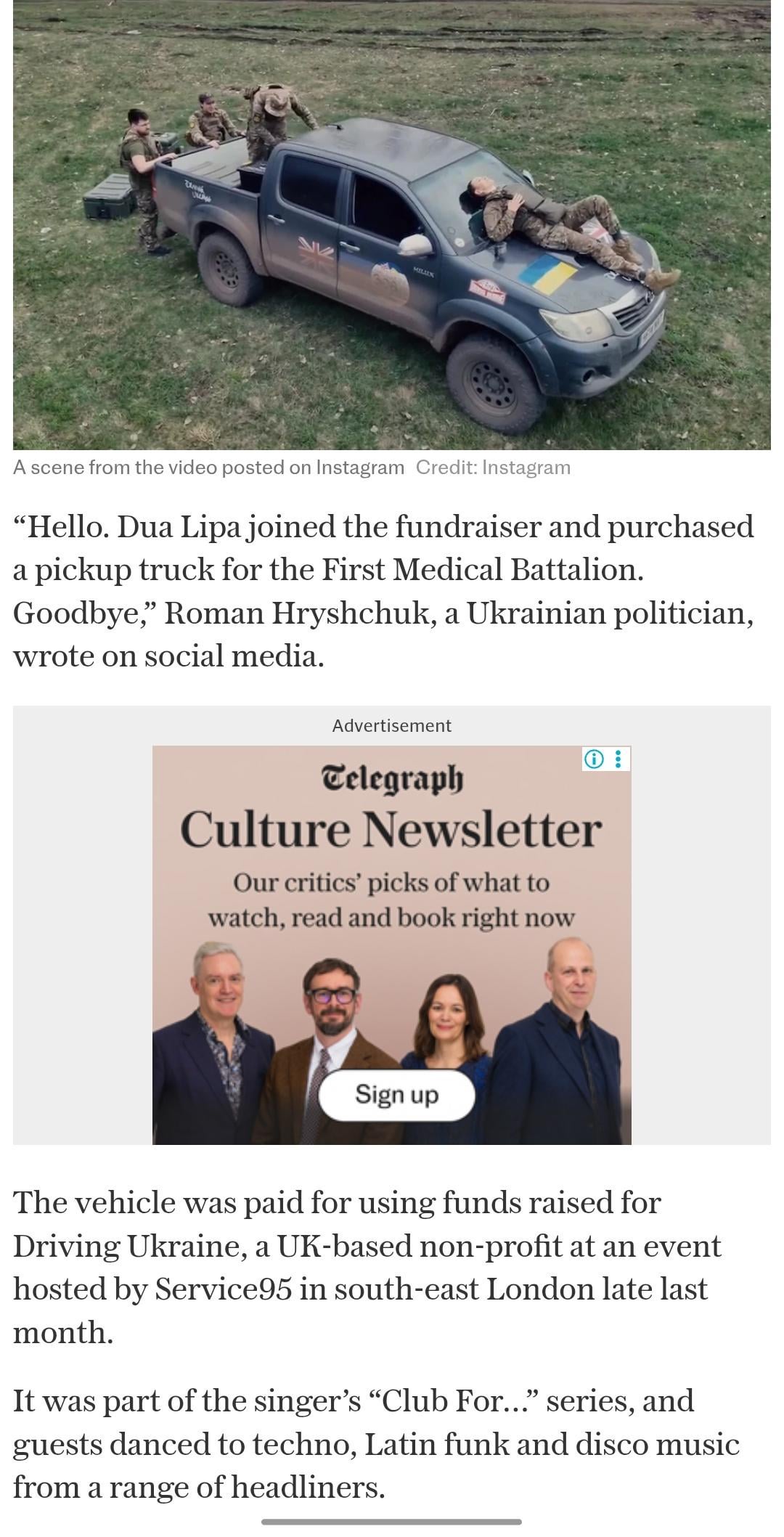 You can read about it here: https://www.telegraph.co.uk/news/2026/04/21/dua-lipa-sends-pickup-truck-to-ukrainian-battalion/