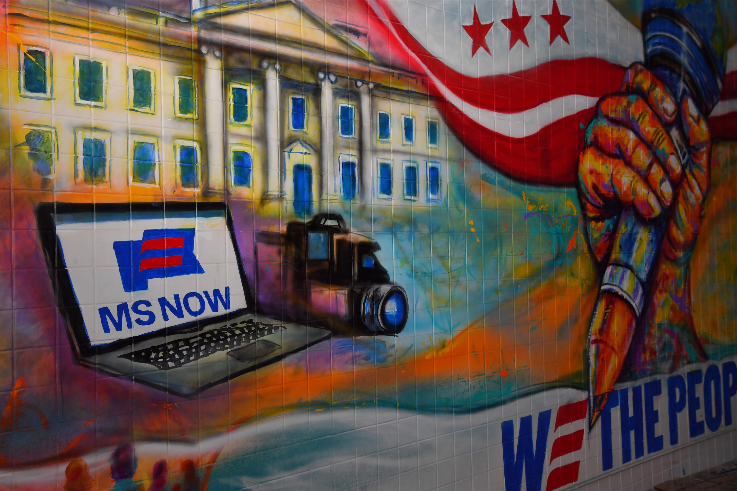 And below is a 10′ x 40′ mural from local artist Jay Coleman; MS NOW commissioned the art installation, which “celebrates the free press and role of journalists in democracy,” as a company spokesperson put it: