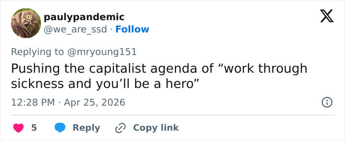 A third commented, “She had the flu what was she thinking being around people infect the entire staff.”