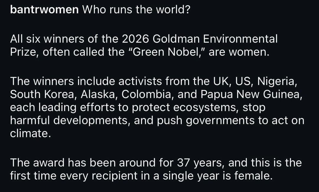 Share Facebook Twitter LinkedIn Pinterest Bluesky Reddit Threads For the first time ever all six winners of the 2026 Goldman Environmental Prize, often called the “Green Nobel,” are women. Posted by mlg1981