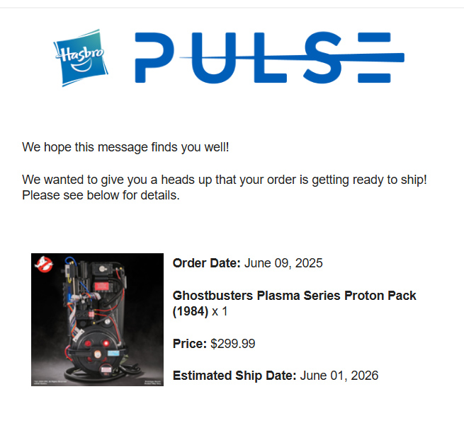 Following last week’s Ecto-Glow Ecto-1 update, which saw “preparing to ship” emails go out, the same notices are now being sent for the Ghostbusters Plasma Series Proton Pack (1984).