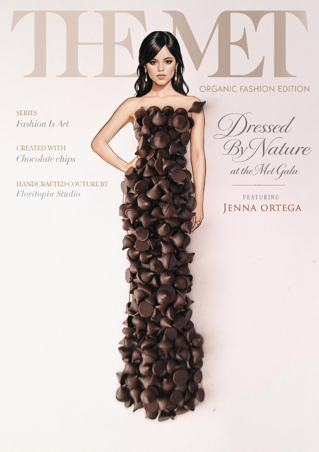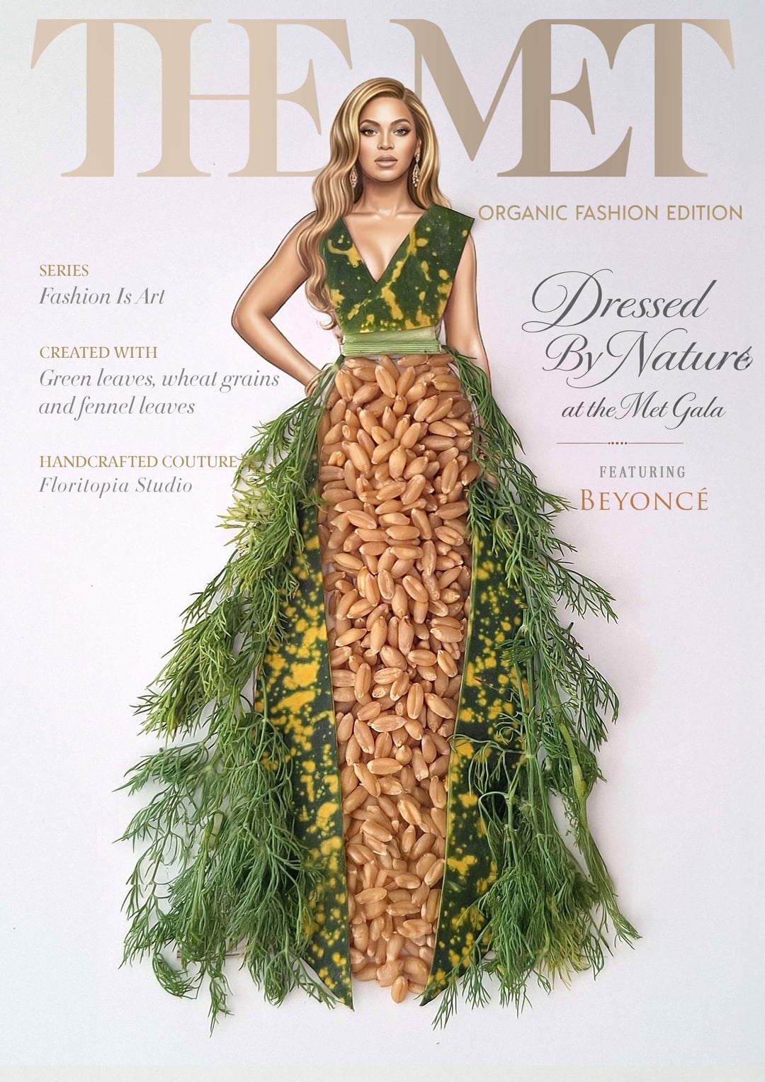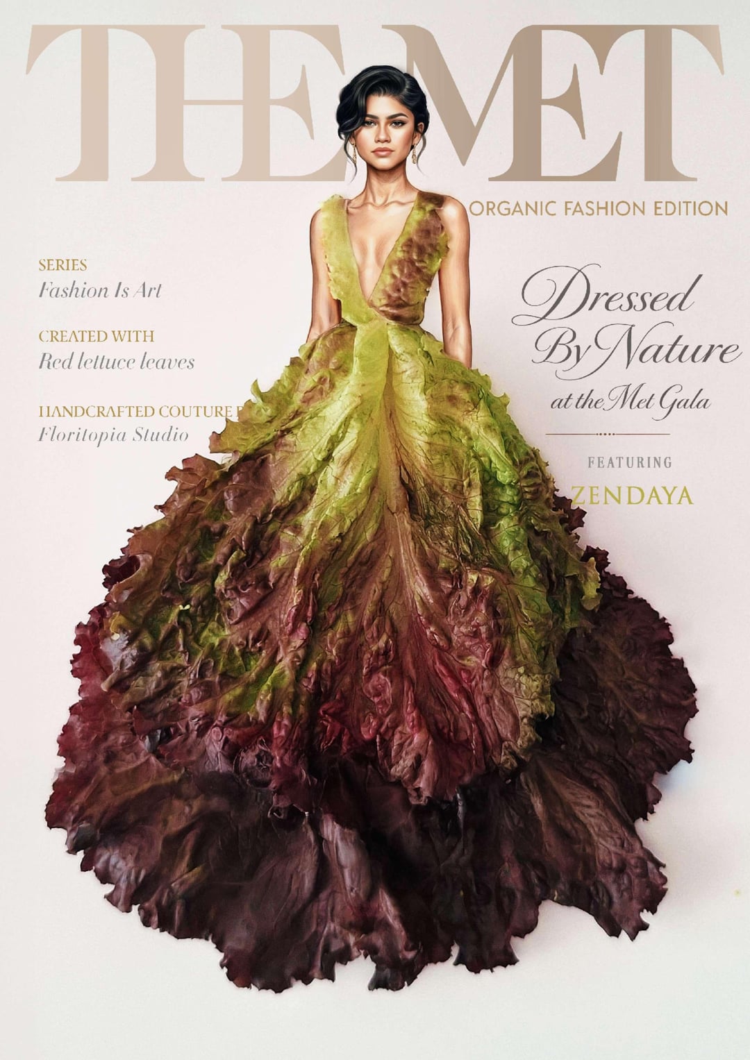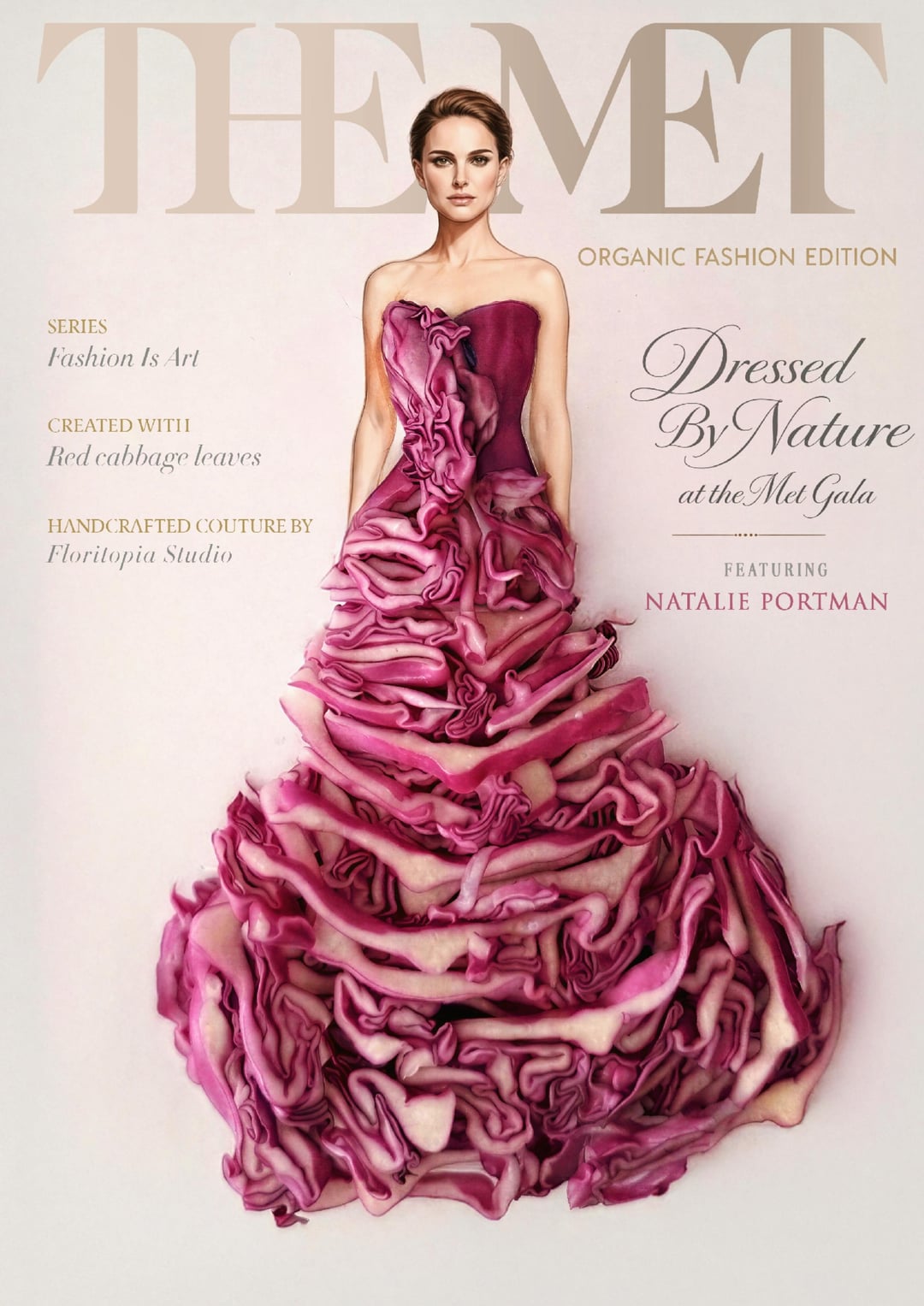 I created a series of magazine-style covers imagining Hollywood stars in couture gowns made from everyday food and organic elements for the Met Gala 2026. A blend of fashion, nature and red-carpet fantasy inspired by the 'Fashion Is Art' theme. Featuring Natalie Portman, Zendaya, Beyoncé and Jenna Ortega.