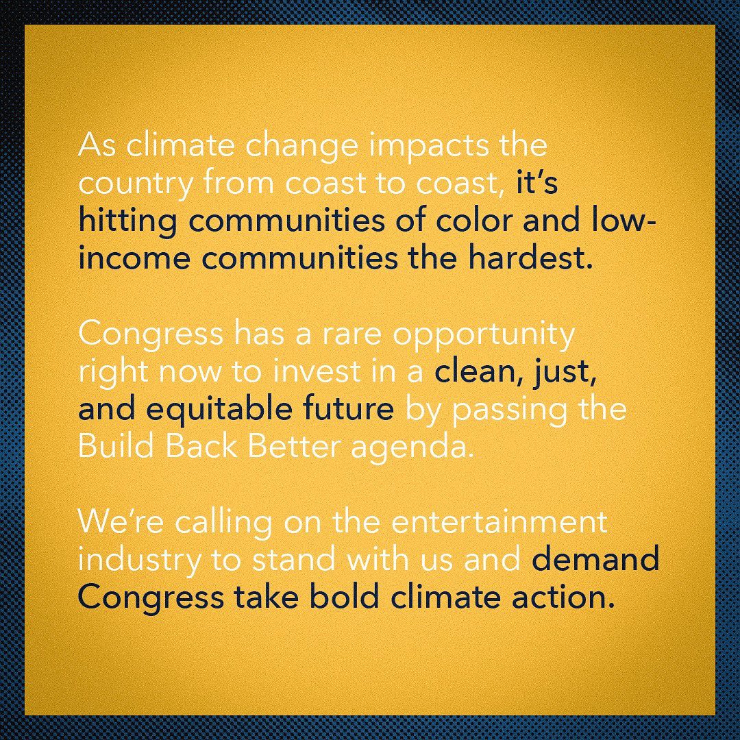 We have a once-in-a-generation opportunity to act boldly to fight the climate crisis, so I am honored to join over 60 fellow artists to call on leaders of the entertainment industry to use their power and demand that Congress pass @potus’s #BuildBackBetter agenda this fall. Head to the link in my bio for our full statement.